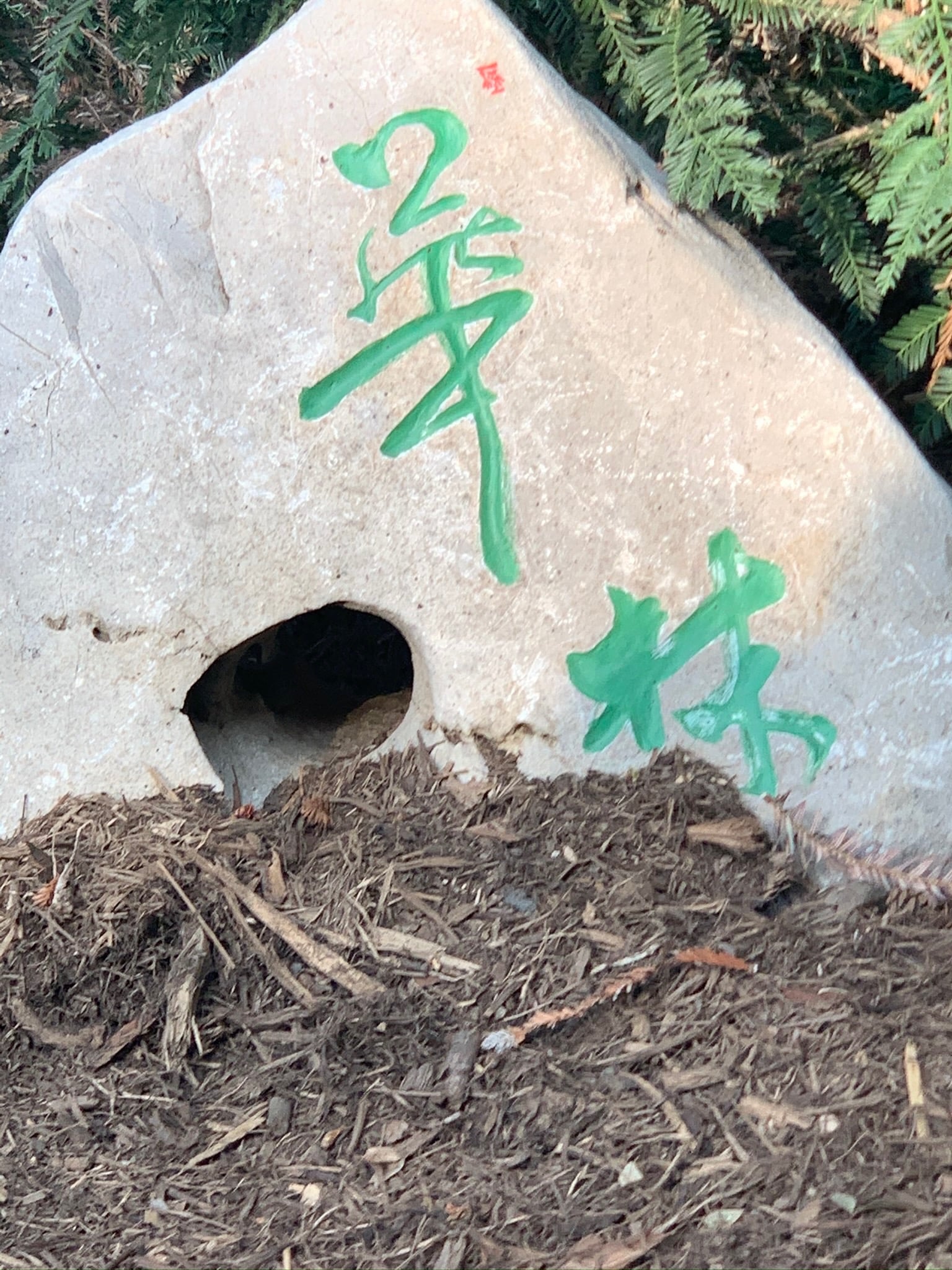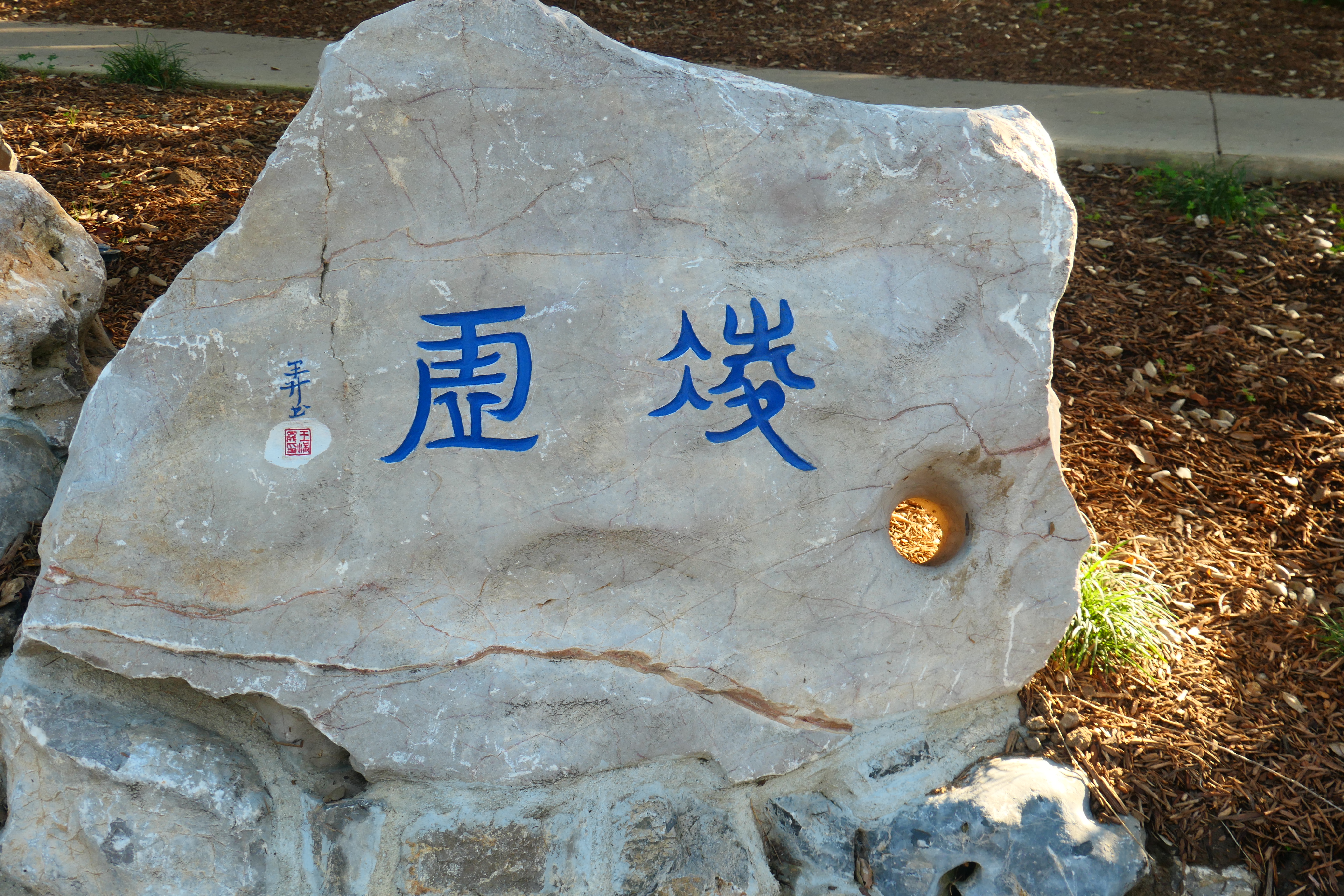 This part of the garden also has a work of calligraphy– incised on a garden rock–by Michael Cherney (More on him below!)